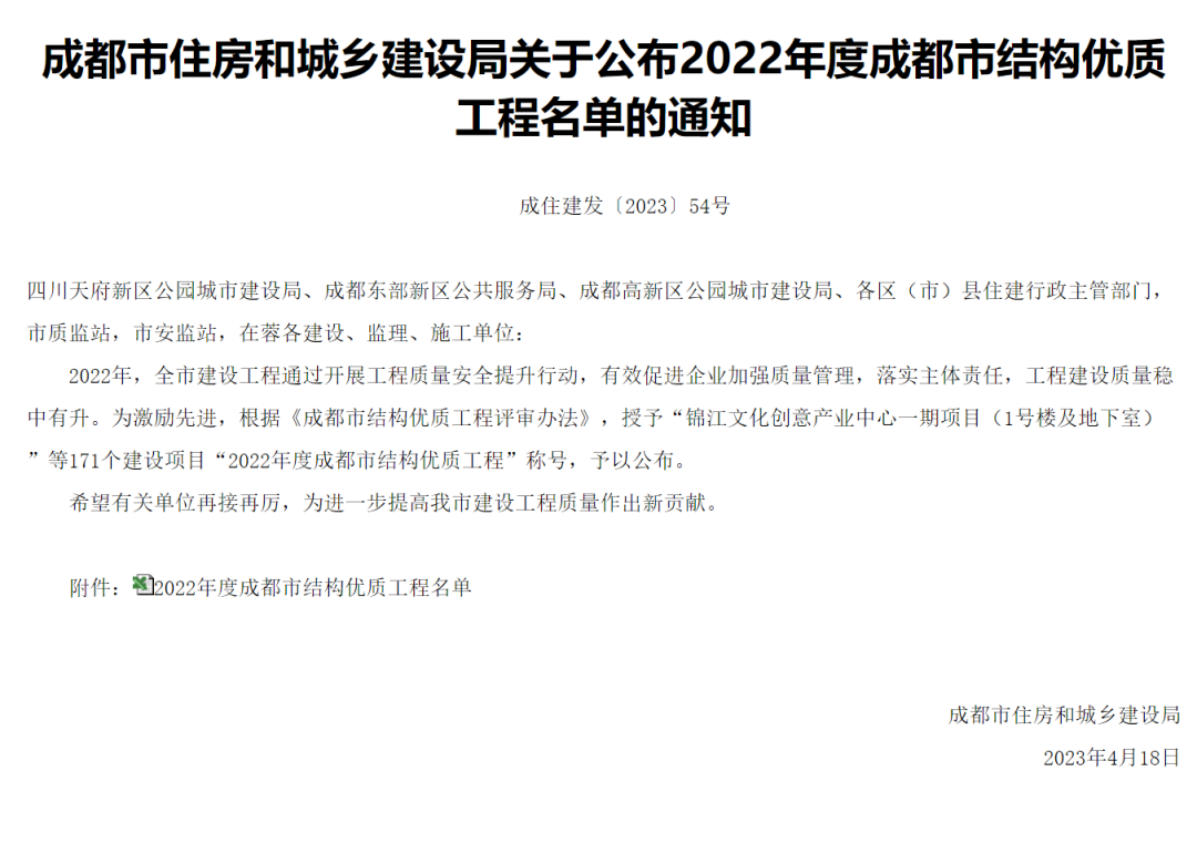 中誠投建工集團三個項目獲2022年度成都“結構優質工程”獎