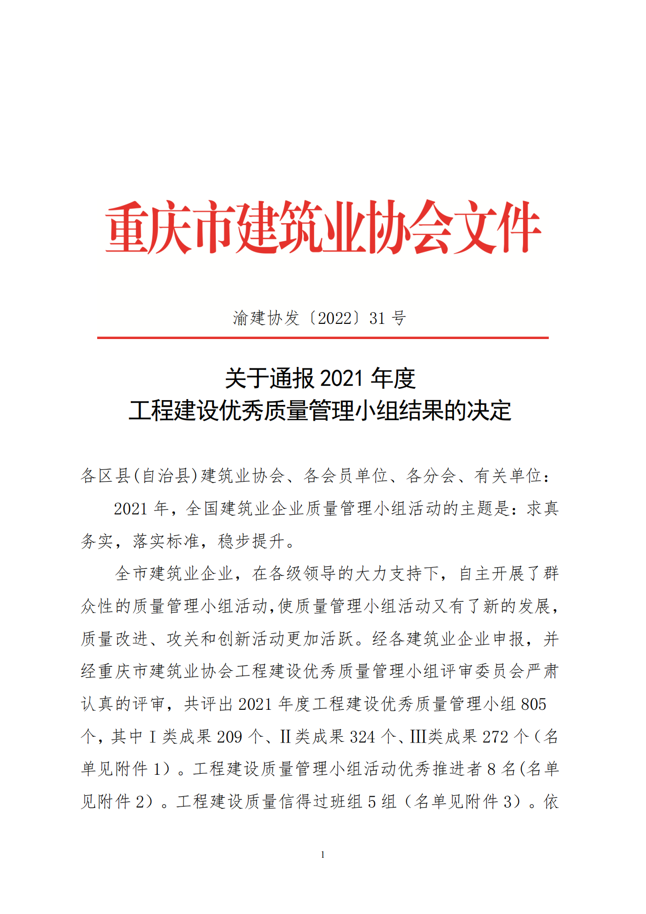 近日,2021年度重慶市工程建設(shè)優(yōu)秀質(zhì)量管理小組成果成績(jī)已公布。集團(tuán)公司龍水城區(qū)五金街片區(qū)棚戶區(qū)改造工程(一期)項(xiàng)目QC小組申報(bào)