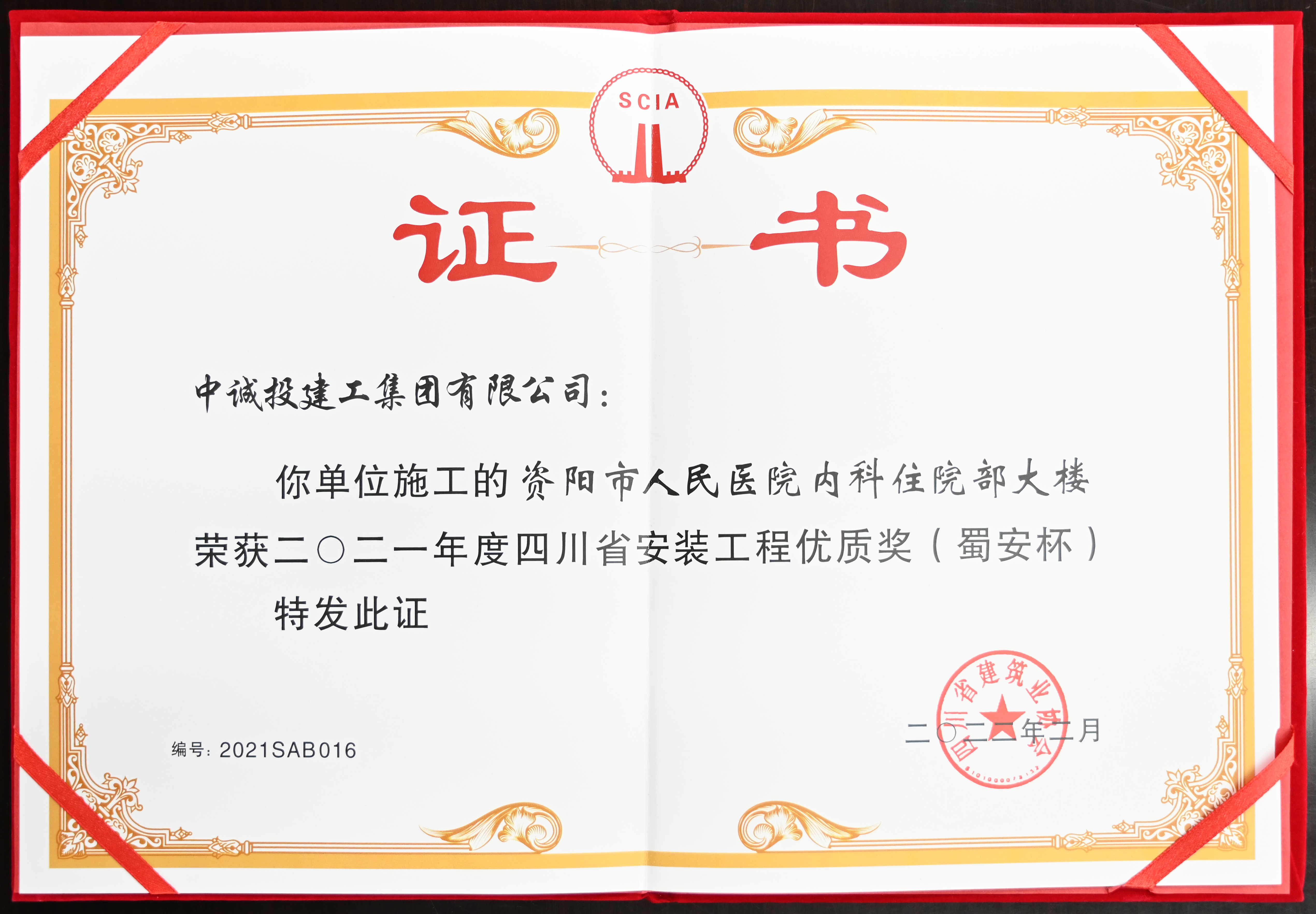 資陽(yáng)市人民醫(yī)院項(xiàng)目榮獲2021年度四川省安裝工程優(yōu)質(zhì)獎(jiǎng)