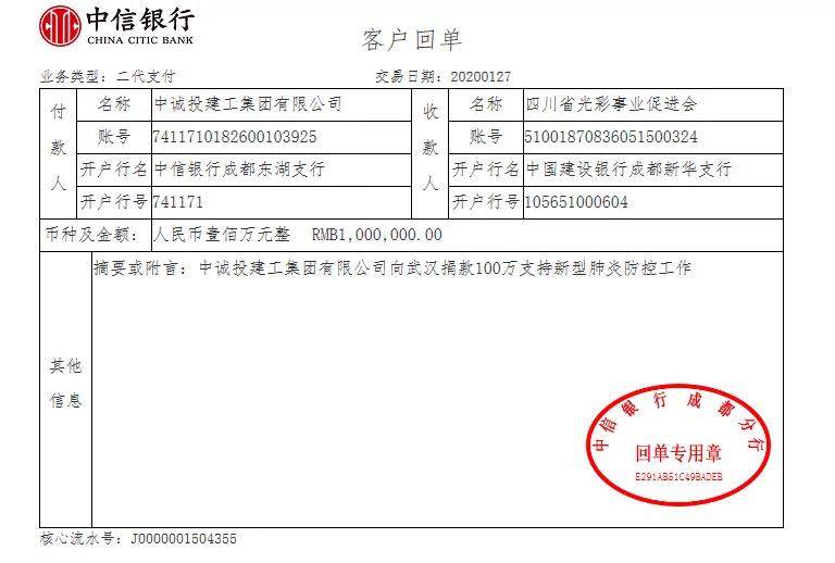1月27日,這筆捐款已經(jīng)匯入四川省光彩事業(yè)促進(jìn)會(huì)的專(zhuān)款賬戶(hù),隨后再由四川光彩事業(yè)促進(jìn)會(huì)以武漢疫情防控專(zhuān)款名義統(tǒng)一匯入武漢市“新冠肺炎防控指揮部”接受捐贈(zèng)的指定賬戶(hù)。