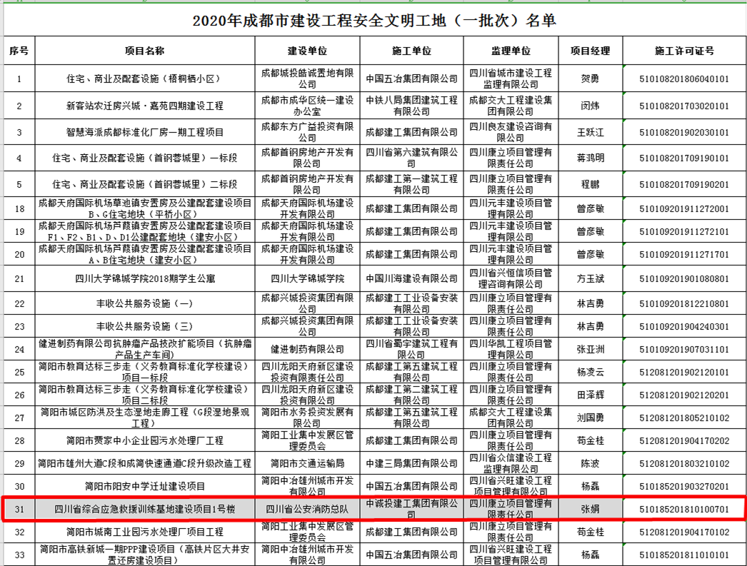 近日,在成都市住房和城鄉(xiāng)建設(shè)局關(guān)于表彰2020年度成都市建設(shè)工程安全文明工地和綠色施工工地(一批次)的項(xiàng)目入選名單中,由集團(tuán)公司承建的四川省綜合應(yīng)急救援訓(xùn)練基地建設(shè)項(xiàng)目榮獲“安全文明工地、綠色施工工地”稱號(hào)。