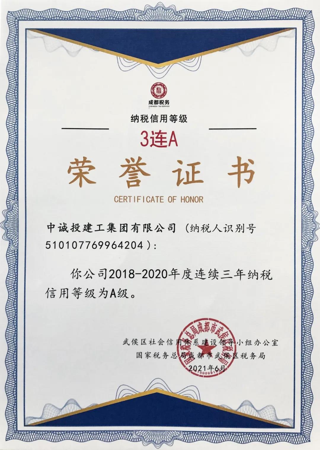 近日,國家稅務總局成都市武侯區稅務局授予中誠投建工集團有限公司“2018—2020年度連續三年納稅信用等級為A級”稱號。
