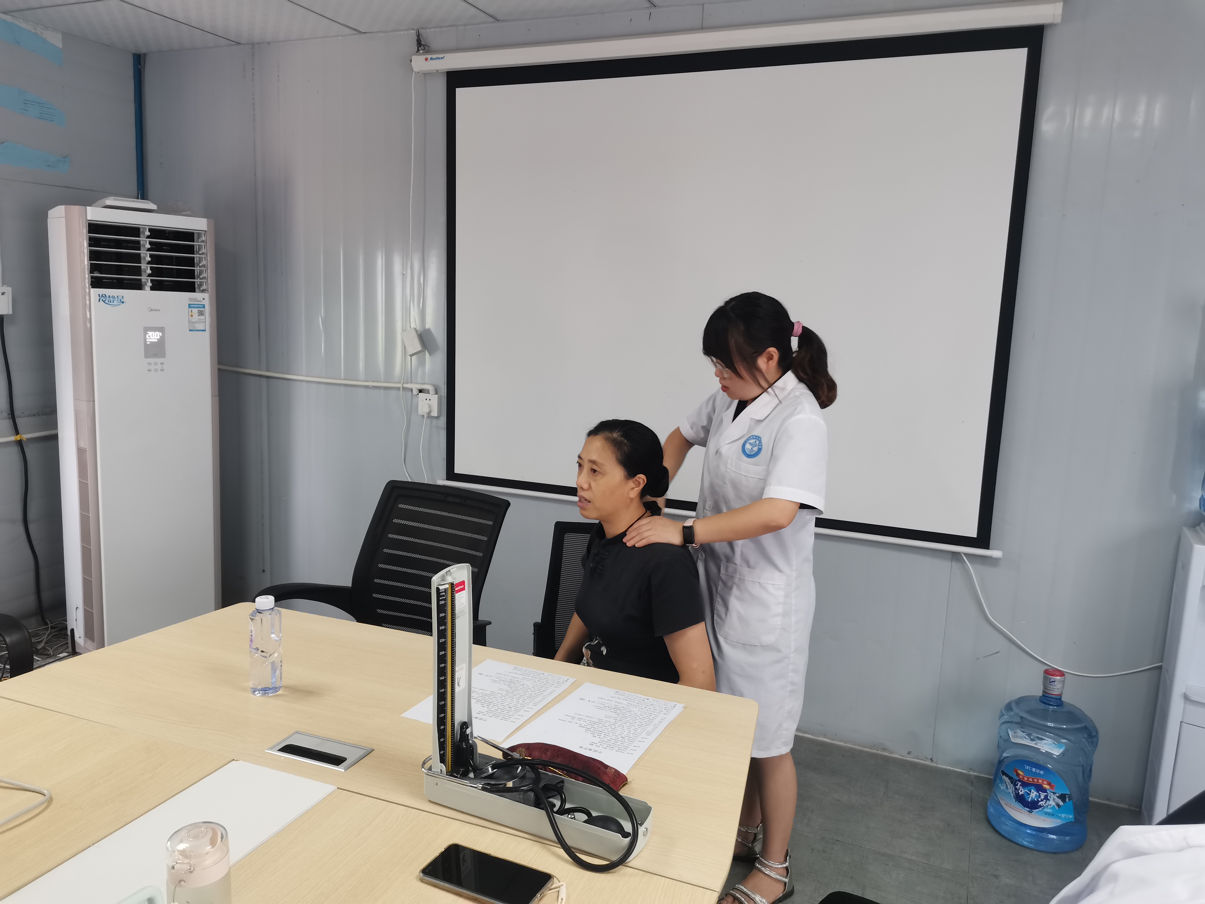 為確保體檢活動有序開展,項目部安排專人對接體檢醫院,制定了詳細的體檢方案。體檢期間,醫務人員為全體人員分別進行了血壓、脈搏、頸椎病、肩周炎、關節炎等常見亞健康問題檢查。