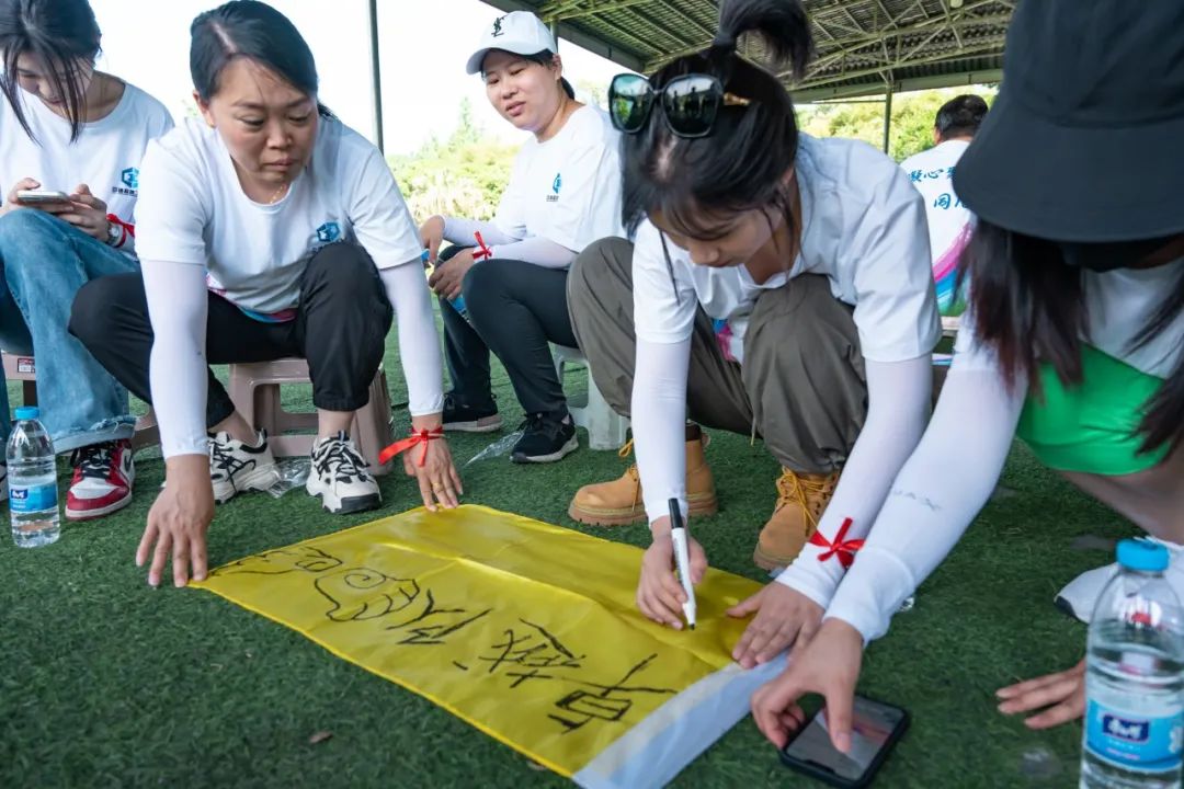 迎著朝陽,聞著花香,大家熱情洋溢、激情四射。經過簡單的熱身活動后,在教練的指揮下,大家迅速組成8支隊伍。選隊長、畫隊旗、喊口號、唱隊歌,擺隊形,活動現場氛圍一下子就熱鬧了起來。“我要飛得更高,飛得更高……”“團結就是力量……”“葫蘆娃,葫蘆娃,風吹雨打都不怕……”飛盤拓展項目在各隊嘹亮的隊歌聲中拉開帷幕。
