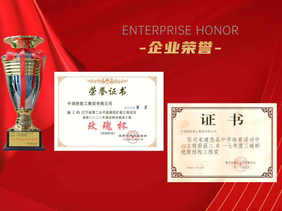 各分公司以雄厚的技術支持、過硬的工程品質、高效的施工建設,贏得了屬地行政主管部門及業主單位一致好評,榮獲了“巴渝杯優質工程獎”“三峽杯優質結構工程獎”“遼寧省建設工程優質結構獎”“沈陽市建設工程玫瑰杯”等數十個省外工程榮譽獎項。