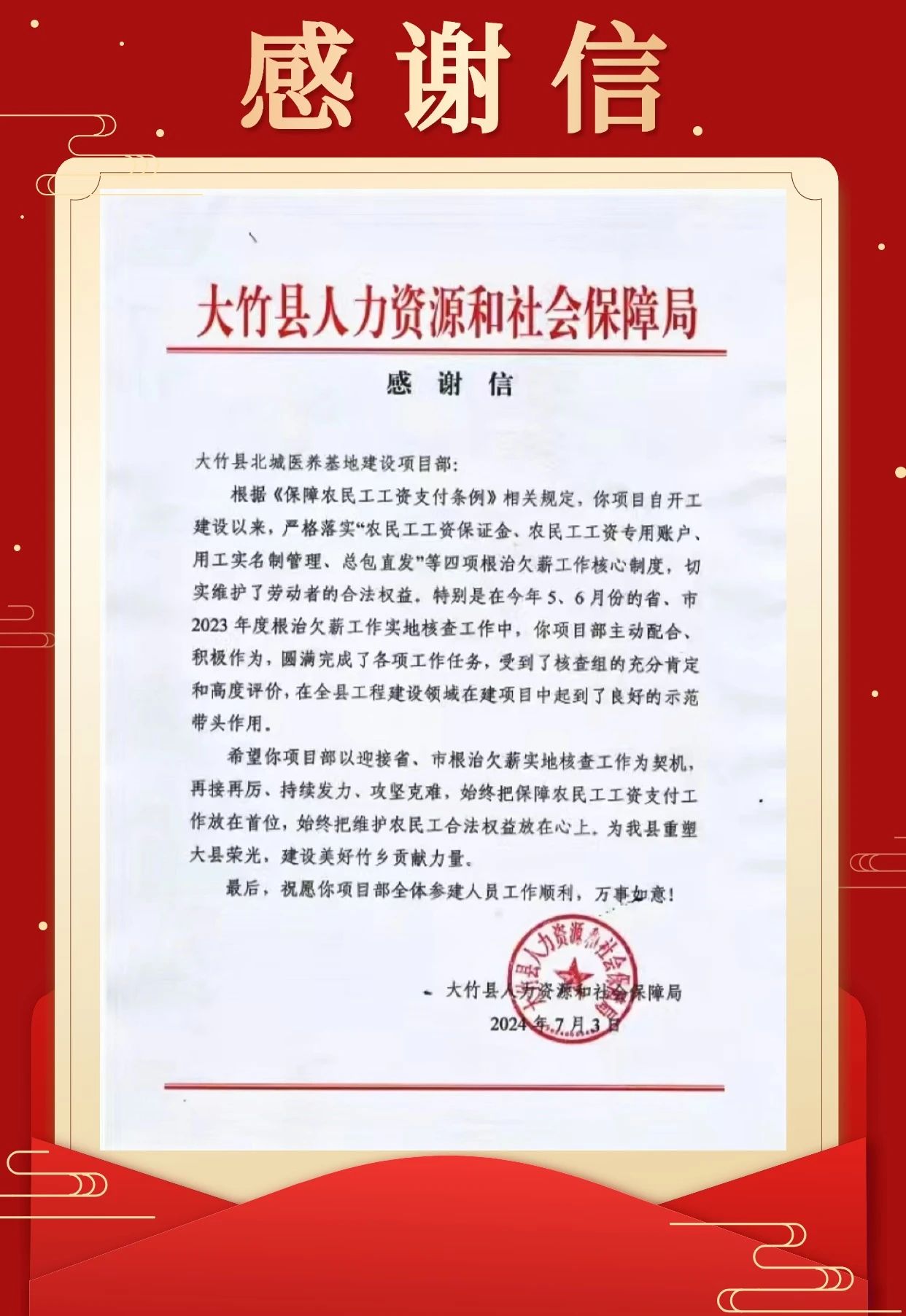制度落地有聲,權益保障有力。感謝信是對大竹縣北城醫養基地建設項目部落實保障農民工工資支付工作的認可與贊許,也是對項目部今后工作的督促與勉勵。中誠投建工集團各項目部將持續加大對各項制度的執行力度,不斷完善管理機制,切實維護好廣大農民工的合法權益,勇于承擔社會責任,以更高的標準、更嚴的要求,為農民工創造更加公平、和諧的工作環境,為社會的繁榮穩定貢獻更多力量。