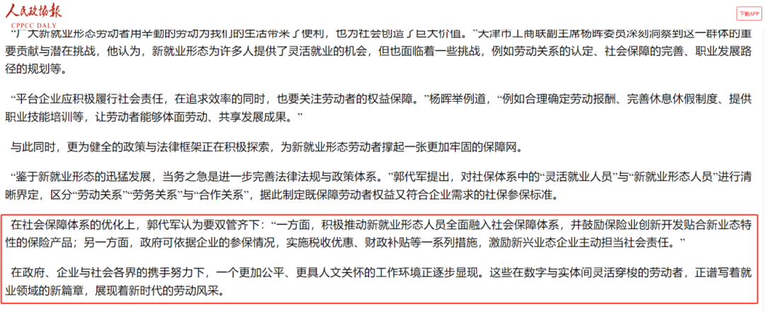 “鑒于新就業(yè)形態(tài)的迅猛發(fā)展,當(dāng)務(wù)之急是進(jìn)一步完善法律法規(guī)與政策體系。”郭代軍提出,對社保體系中的“靈活就業(yè)人員”與“新就業(yè)形態(tài)人員”進(jìn)行清晰界定,區(qū)分“勞動關(guān)系”“勞務(wù)關(guān)系”與“合作關(guān)系”,據(jù)此制定既保障勞動者權(quán)益又符合企業(yè)需求的社保參保標(biāo)準(zhǔn)。