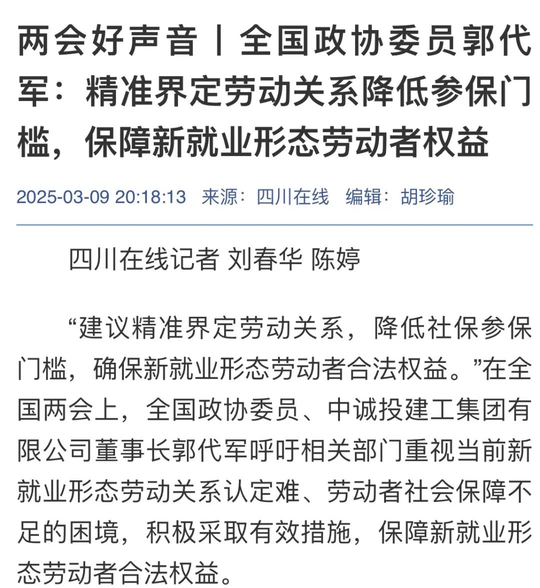政府工作報告提出“加強(qiáng)靈活就業(yè)和新就業(yè)形態(tài)勞動者權(quán)益保障”。如何在新就業(yè)形態(tài)下有效保障勞動者的權(quán)益?郭代軍帶來了自己的思考——